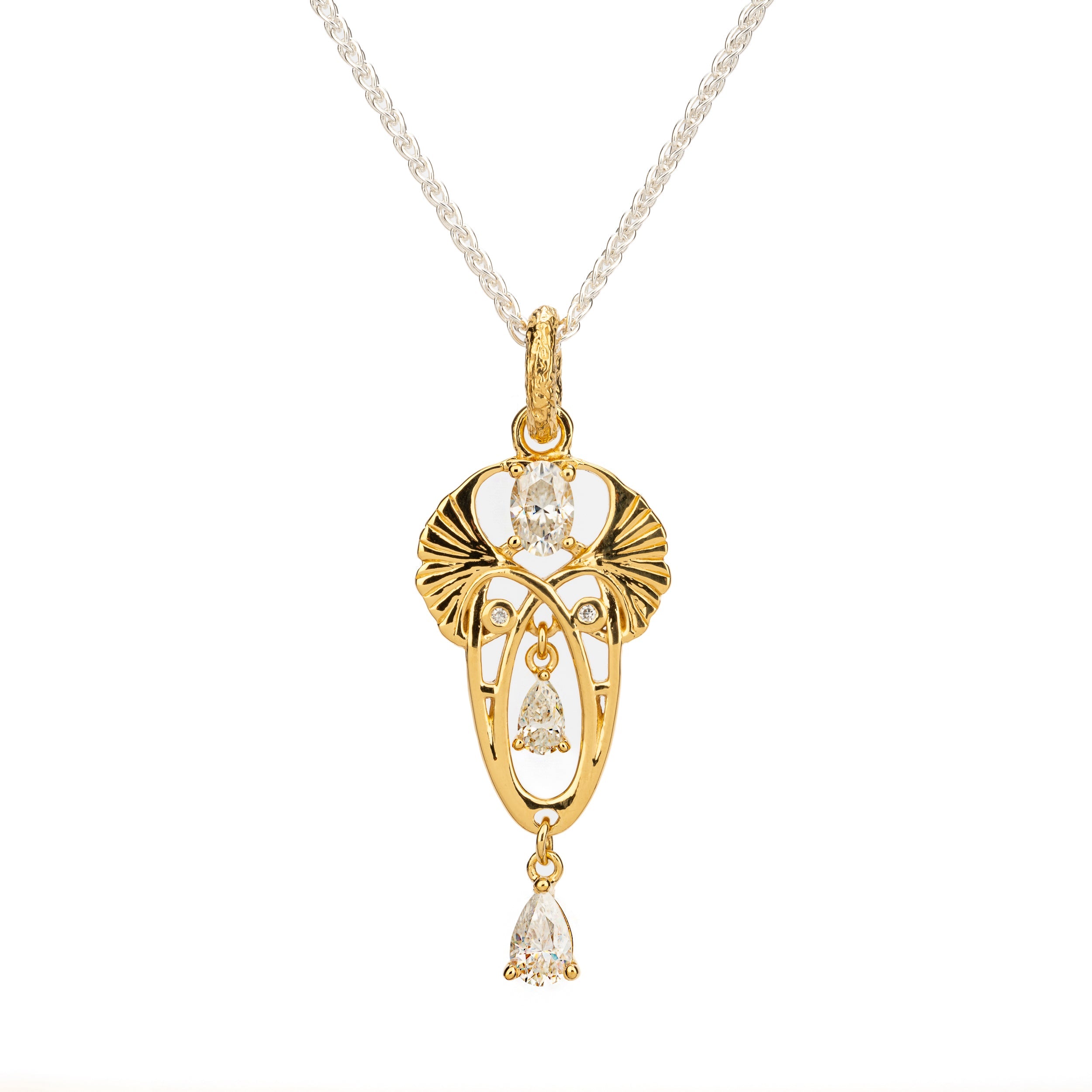 Materials: 24k Vermeil (3 micron) over Sterling Silver with White Moissanites (Pear 4mm x 6mm, 3mm x5mm, Oval 4mm x 6mm, Round 1.3mm)