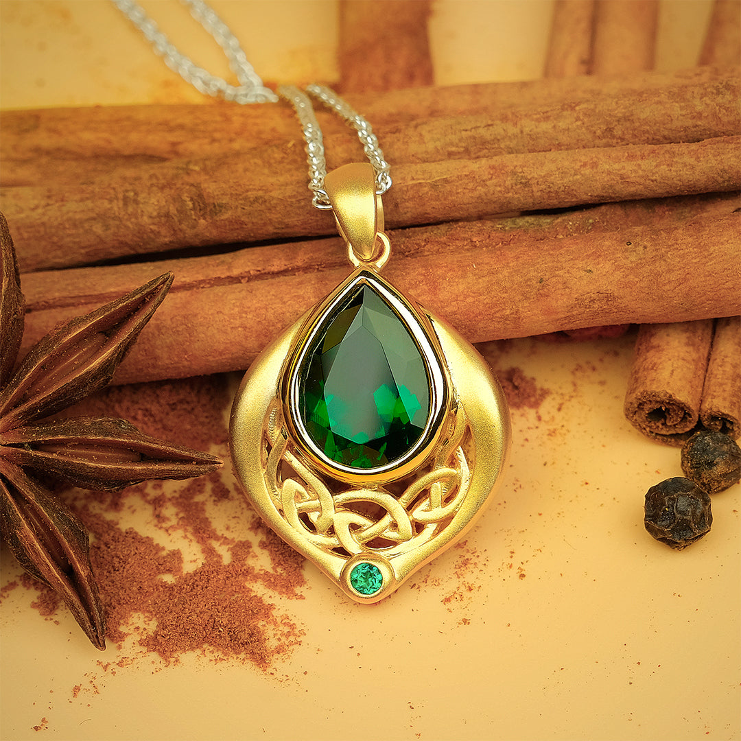 Materials: 24k Vermeil (3 micron) over Sterling Silver with Lab Grown Emerald (Pear 10mm x 14mm, Round 2.5mm)