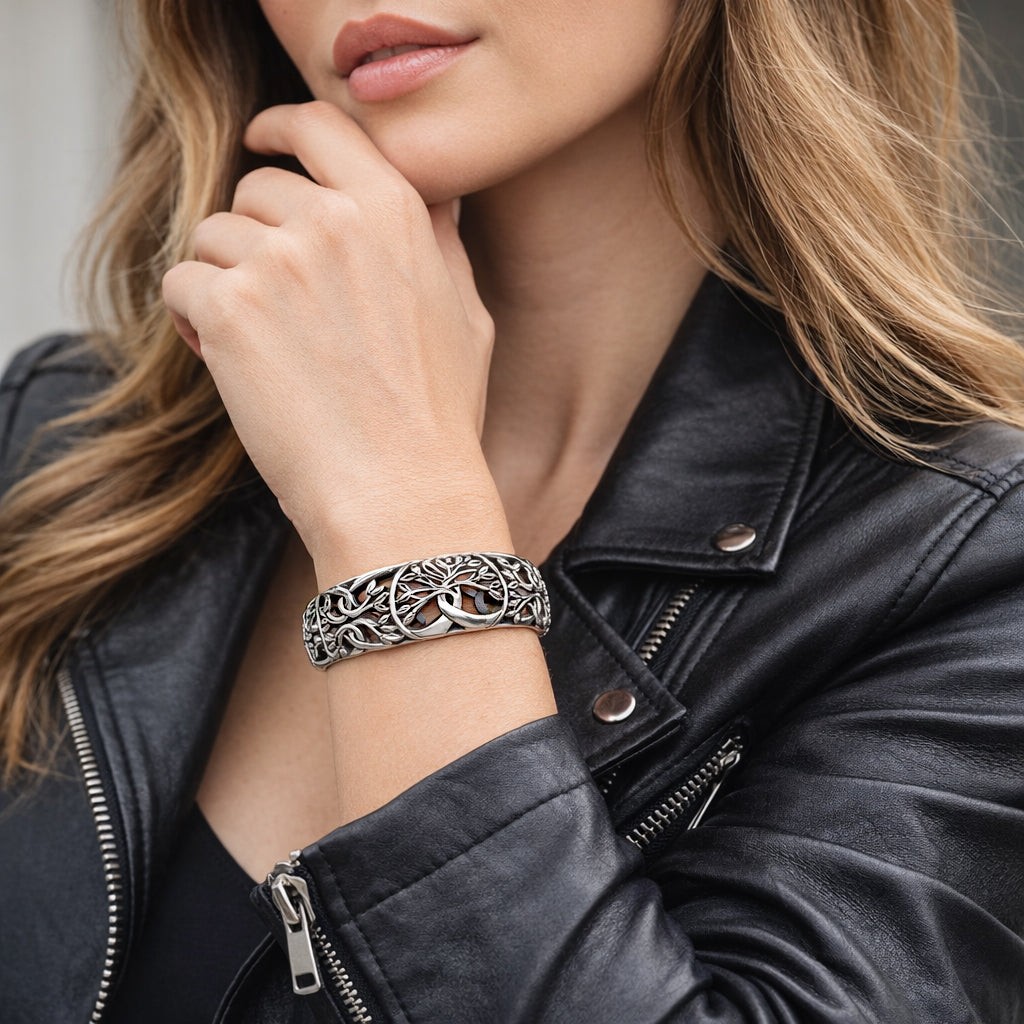 This bangle in sterling silver is a testament to the whimsy and enchanting embrace of the Tree of Life: handcrafted with care.