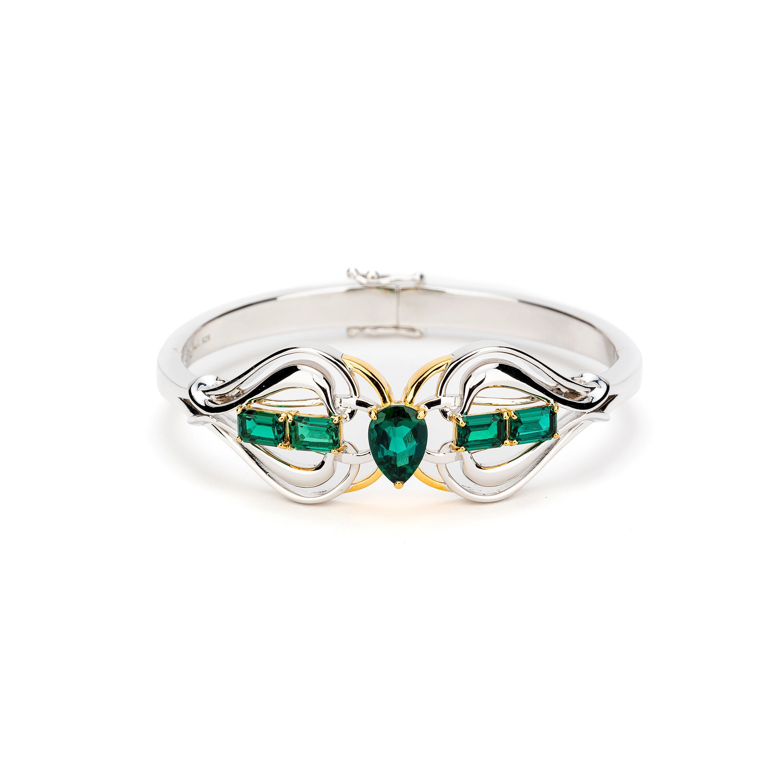 Materials: Sterling Silver, Rhodium and 18k Vermeil (2.5micron), Lab Grown Emeralds (Pear Cut 10mm x 7mm and Emerald Cut 6mm x 4mm)