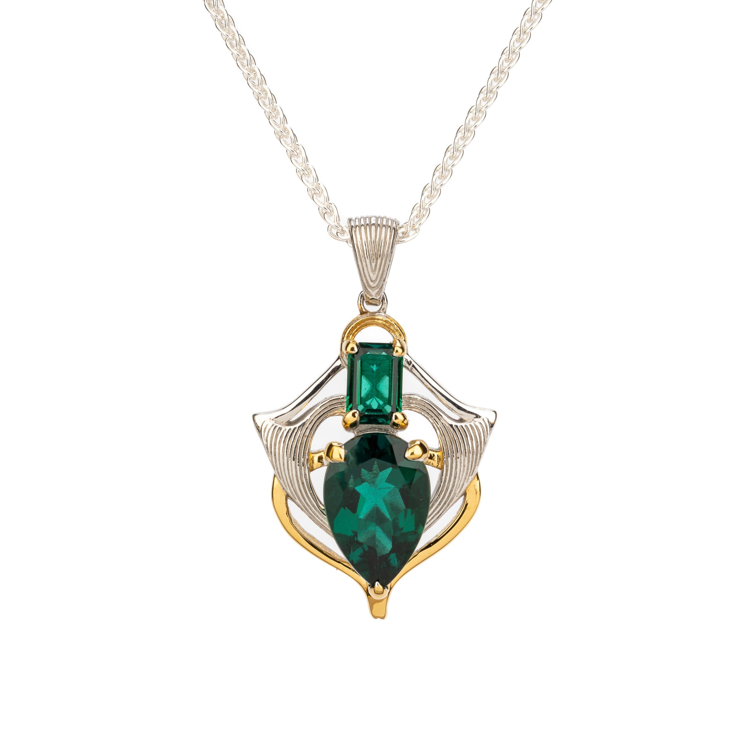 Materials: Sterling Silver and18k Vermeil (2.5micron) with Lab Grown Emerald (Pear Cut 12mm x 8mm, Emerald Cut 6mm x 4mm)